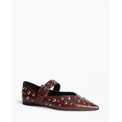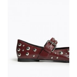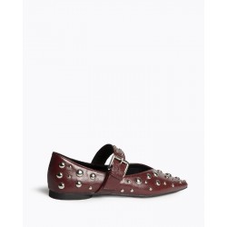 Zapato plano, acabado en punta, de polipiel y tachas de diferentes tamaños, en la parte superior cierre con hebilla para mayor sujeción del pie