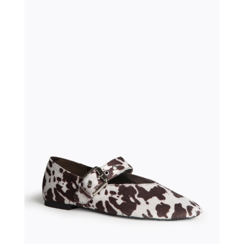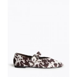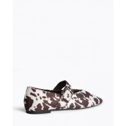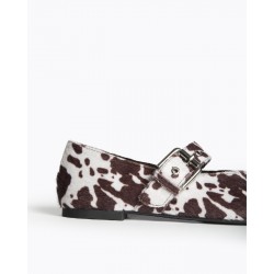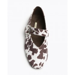 Bailarina con estampado de vaca y tejito de pelito y cierre con hebilla en la parte superior para mayor sujeción del pie