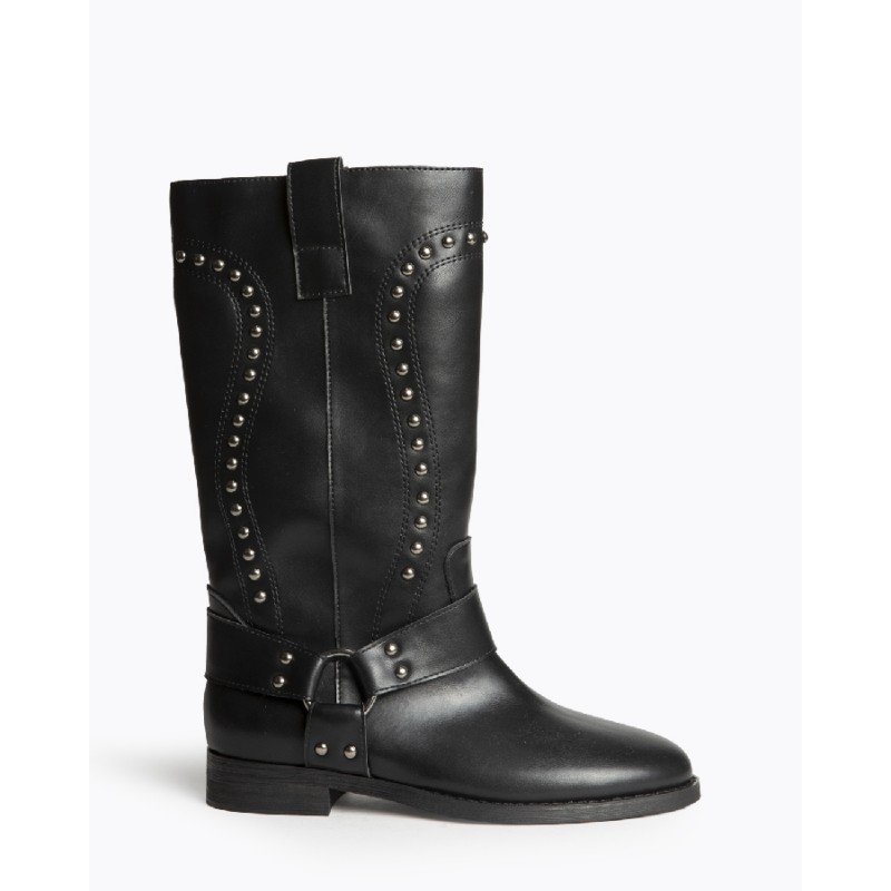 Diseño en color negro con tachasmetálicas que recorren la caña y la correadecorativa con hebilla, que realzan su esencia motera.