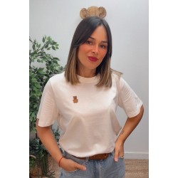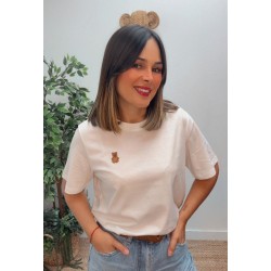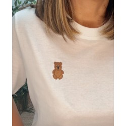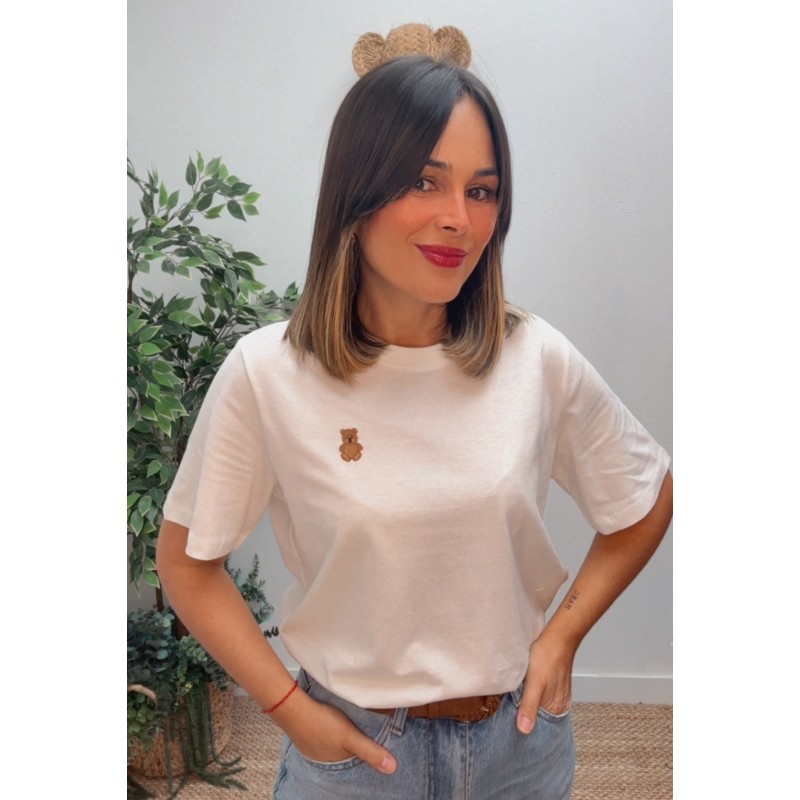 Camiseta básica blanca de manga corta y cuello redondo con detalle de oso bordado.