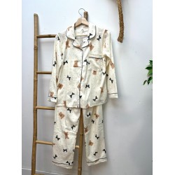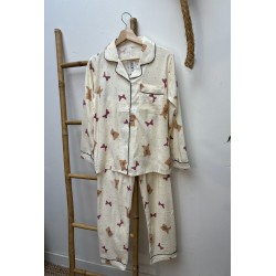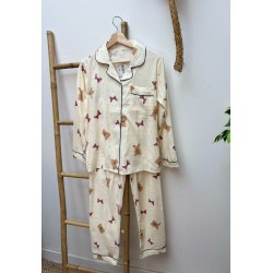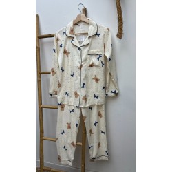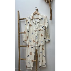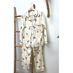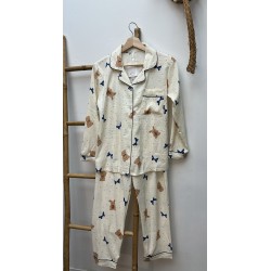 Pijama de dos piezas compuesto por parte de abajo con pierna recta y cintura engomada y la parte de arriba es camisera