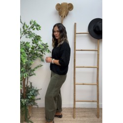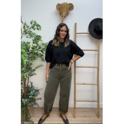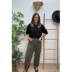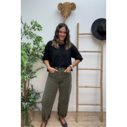 Pantalón vaquero estilo barrel con bolsillos y elastano , cede bastante .