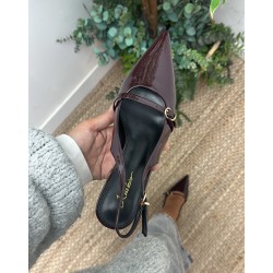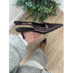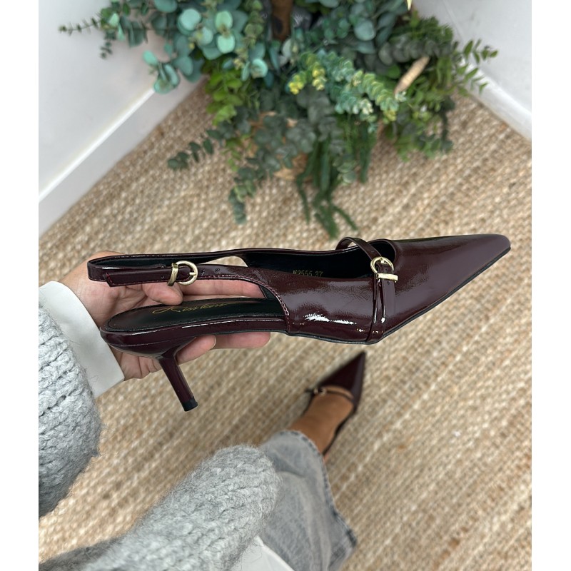 Zapato destalonado burdeos de charol y detalle de hebilla en la parte delantera con tacon de 6cm.